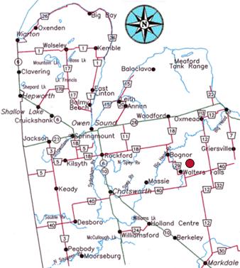 LOCATION: The cabin is situated on the 6th Sideroad of Sydenham Township, 2 blocks East of Bognor and 2 blocks North-East of Walters Falls. Address: Rainbow’s End Farm, Fire Nos: 084796/084798, RR8, Owen Sound, ON N4K 5W4. GPS: N44o 31’3” W80o 43’3” We are approx. 2.5 hours north of Toronto. If driving from Hwy 10: drive to and through Markdale on the highway, turn right at the Artemesia-Holland Townline and drive until you see Euphrasia-Holland Townline and it becomes Grey Road 29. You will come to a 4-way stop at Walter’s Falls where you will turn right onto Victoria St. and go to the t-intersection at the Holland-Euphrasia Townline where you will turn left. Stay on the townline, down a steep hill to stop sign and go across sideroads 3/4; you will keep on the townline which becomes the Sydenham-St. Vincent Townline. Proceed down another steep hill and the 6th sideroad is at the bottom on the left. Rainbow’s End Farm (there is a sign) is the first on the left on that sideroad and the (blue) cabin can be seen from the road. If driving from Hwy 6, turn right onto Grey Rd. 12 after the town of Durham and this will take you to the lights in Markdale. Turn left at the lights on Hwy 10 and follow instructions above as for driving on Hwy 10. From Hwy 400 to Hwy 26 north of Collingwood, drive approx. 20 km on Hwy 26 from Collingwood towards Thornbury and take Grey Rd. 40 (left off Hwy 26) to the t-intersection/Walter’s Falls intersection. Turn right there and drive (County Rd. 29) to stop sign at Walter’s Falls and turn right onto Victoria St and follow instructions as for Hwy 10. Please call/email if you need clearer directions. |